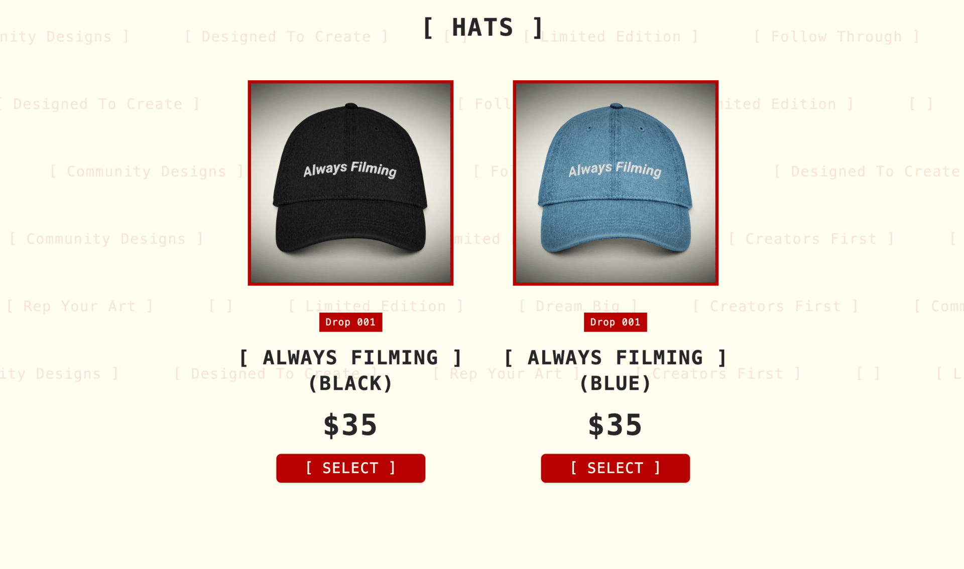 Between new website styling (Ivory and Red, currently) and some epic ‘Always Filming’ limited edition hats, we’re having a blast finding the voice and the style of this company. We’ll never stop evolving. And in fact, our site will likely visually change each month. But we’ll be incorporating a system where you can pick to view it how you’d like.